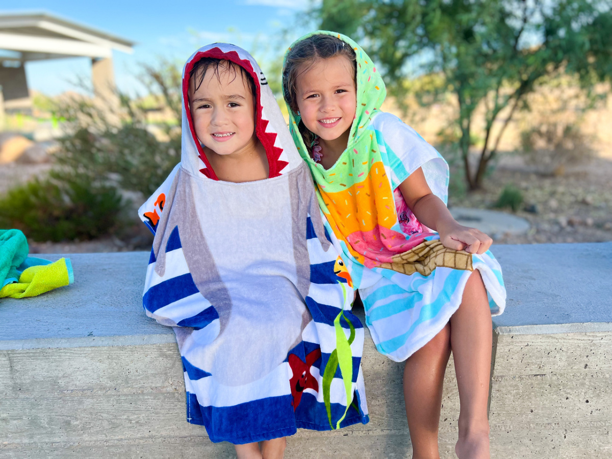 These hooded towels are available in two fun prints: ice cream cone and unicorn! They’re perfect for wrapping up after getting out of the pool or lake, and they’d be fun at bathtime, too!