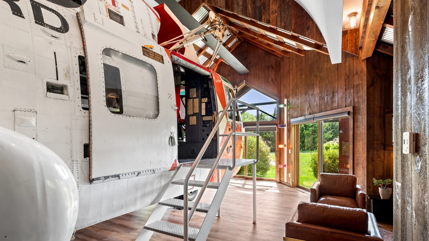 The accommodations are as unconventional as they are luxurious. Fifteen architects were commissioned to design eighteen individual cottages, each with its own narrative and architectural identity. The result feels more like a collection of private works of art than a resort. Among the most striking is the Helicopter Cottage, built around a fully restored 1968 Sikorsky Sea King rescue helicopter whose cockpit remains intact, allowing guests to sit at the controls while staying inside their room. The Treehouse Cottage rises thirty-five feet above the forest floor, its two stories connected by a spiral stair and wrapped in glass and timber, giving a view through the canopy. Every cottage features fireplaces, jetted soaking tubs, and private outdoor seating areas, while details like reclaimed wood, exposed stone, and handmade fixtures give the interiors an element of craft rather than contrivance.