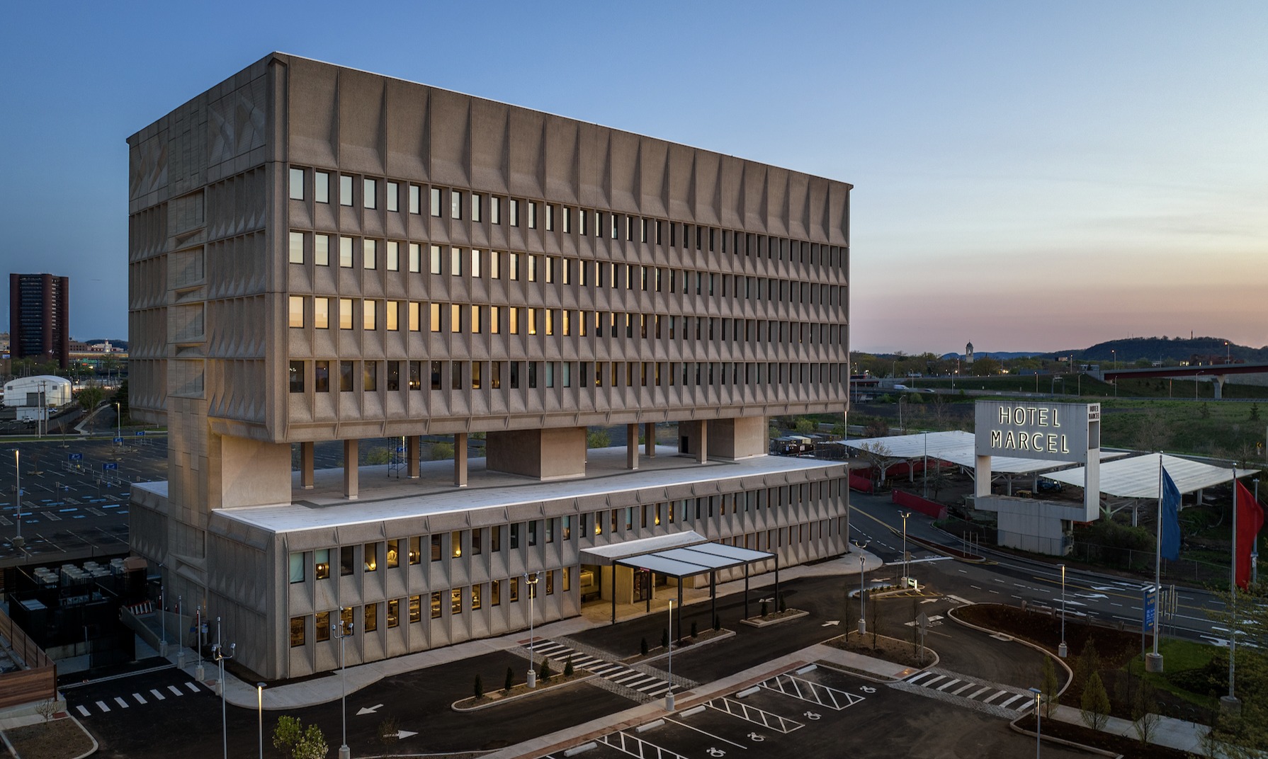 In 2022, the building was transformed into Hotel Marcel, the first net-zero hotel in the United States. The renovation preserved the original architectural elements while integrating sustainable features, including photovoltaic solar panels and energy-efficient systems. The 165-room boutique hotel offers an interior design that balances the rawness of the concrete with warmth, incorporating natural materials and mid-century modern furnishings.