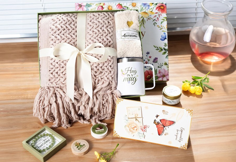Treat someone special to a little pampering with this self-care gift box. Inside, they’ll find a knitted throw blanket, fuzzy socks, a scented candle, aromatherapy shower steamers, an engraved bracelet, and an insulated mug.