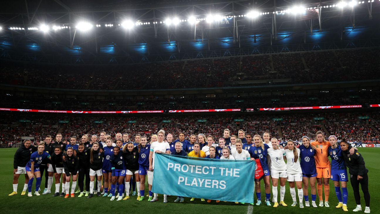 A collective prematch team photograph with the players of the European champions (England) and world champions (United States) standing together behind a banner saying, “Protect The Players” was a direct response to the shocking findings of an independent report which found “systemic verbal and emotional abuse and sexual misconduct” in the National Women’s Soccer League.